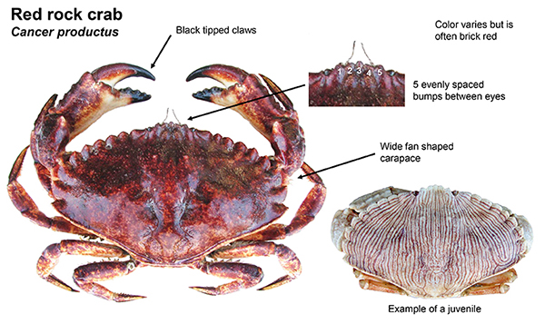 The Pacific rock crab (Cancer antennarius) inhabits similar habitats as the red rock crab, however is more often found in the nearshore ocean. Occasionally, these crab are caught in the bay. They are easily discerned from red rock crab by their spotted undersides, brown/ purple color, and more haired legs. It's species name "antennarius" is Latin meaning "antennae" this refers to the noticeable larger antennae of this species when compared to other cancer crabs. Comparison photo