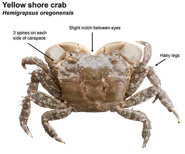 Green crab, Carcinus maenas, are an invasive species in Oregon. They can be a variety of colors. Most commonly they are greenish mixed with yellow, and often with red or orange color at their joints and abdomen. In Oregon, green crab typically inhabit shallow rocky areas of mildly salty waters in the mid to upper estuary. They may be restricted to these habitats in part by the native red rock crab, Cancer productus. Much like the familiar Dungeness crab, young green crab will more often be found higher in estuaries than adults. When green crabs try to cohabitate with red rock crab, adult green crab in the lower estuaries often become a food source for Dungeness and red rock.