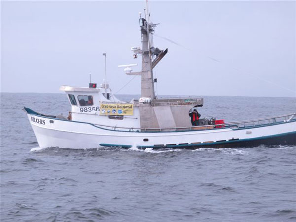 The FV Kilchis, a crabbing vessel out of Garibaldi, tows side-scan sonar gear used to locate lost crab pots.