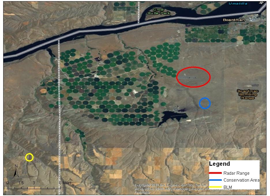Map shows location of bombing range, radar range, Boardman Conservation Area and a relocation site on BLM land.