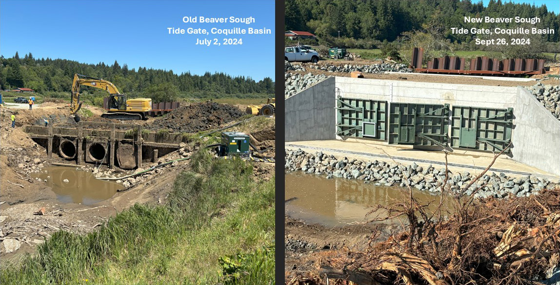 Thanks to the many partners on the project including the Coquille Indian Tribe, Coaledo Drainage District, The Bridges Foundation, the Coos Soil and Water Conservation District and private landowners in the area. Engineering assistance was provided by River Design Group (RDG) and tide gate fabrication/technology by Nehalem Marine.