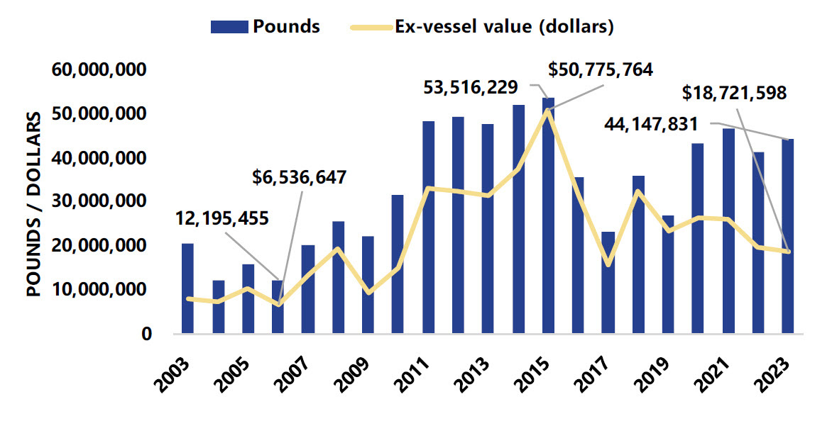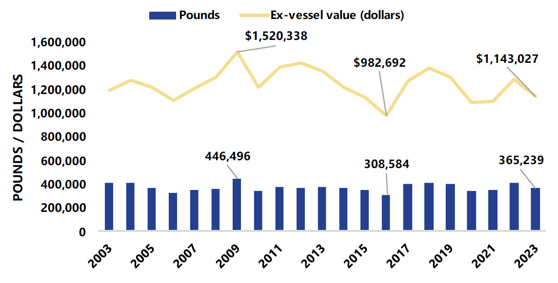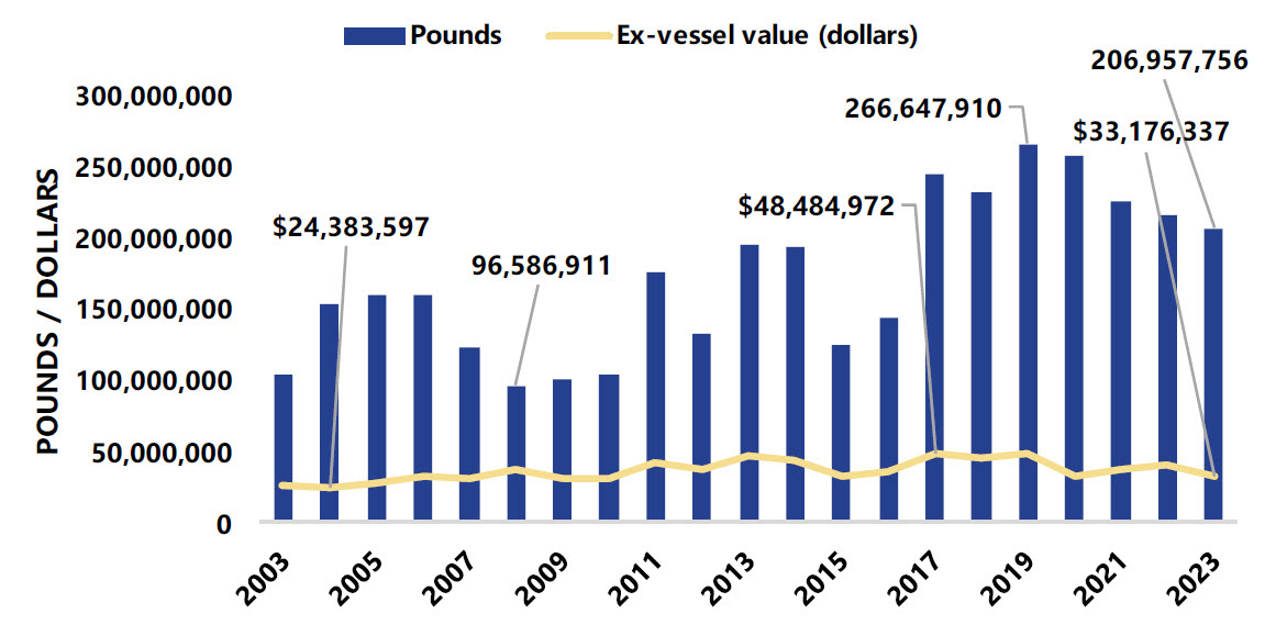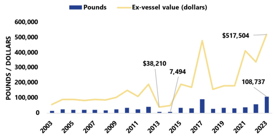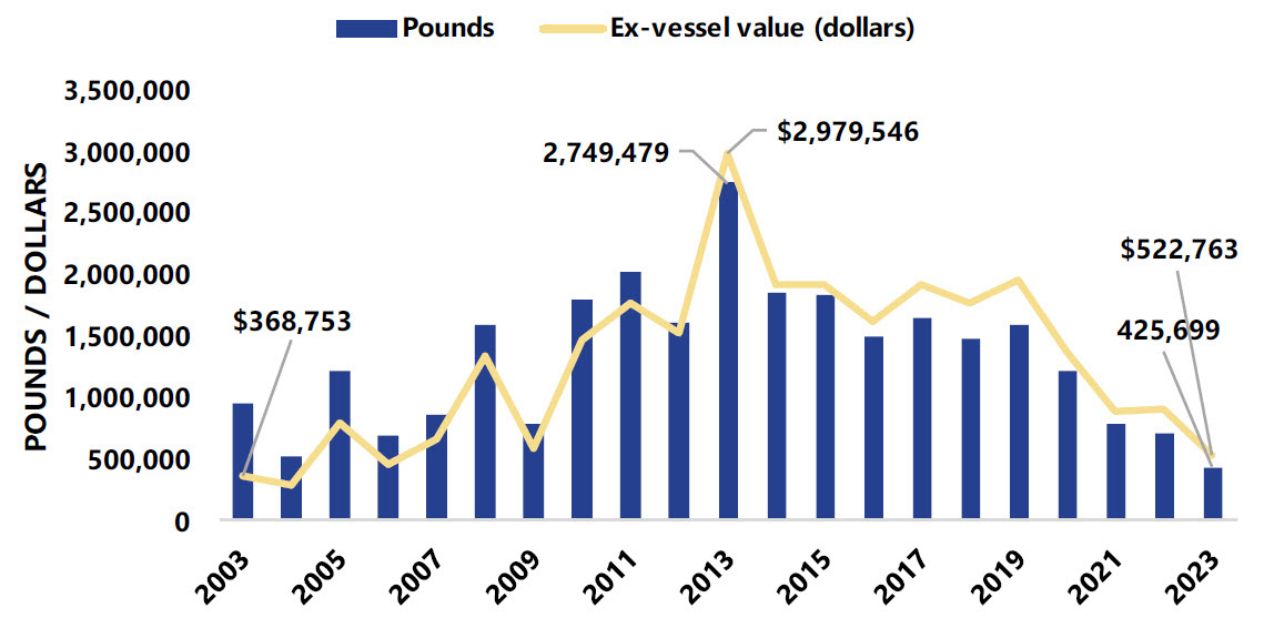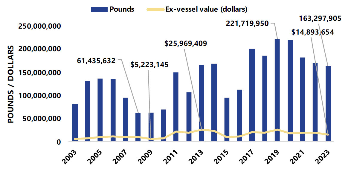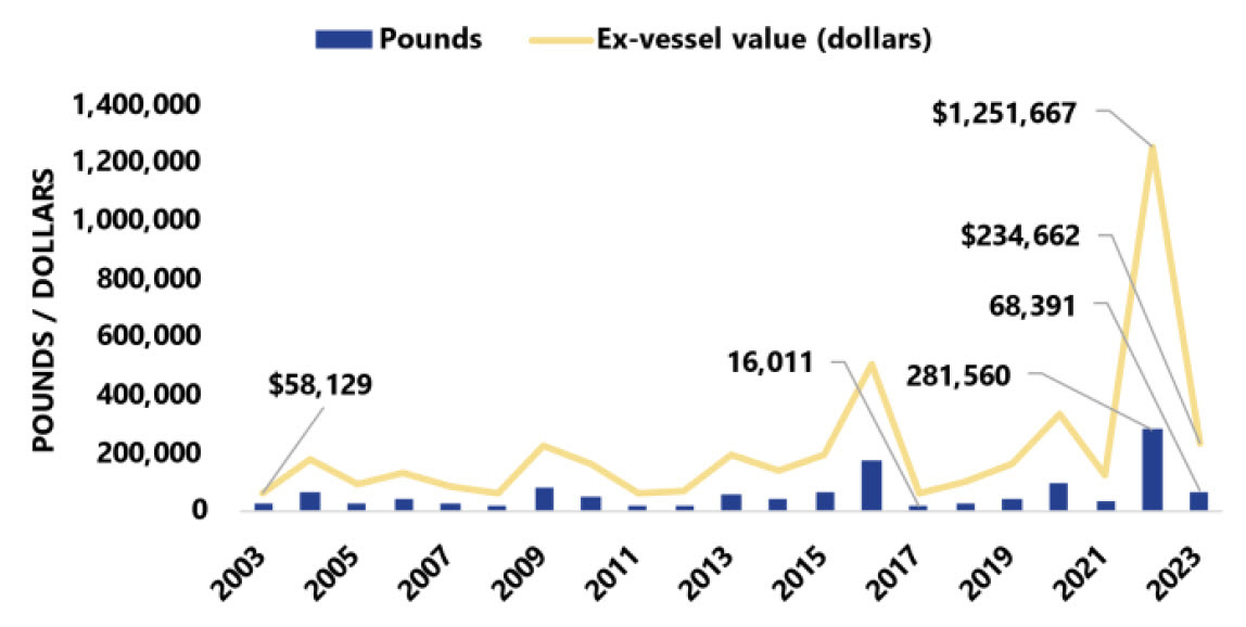 | Hagfish landings and ex-vessel values (adjusted for inflation, 2023), from 2003-2023. |