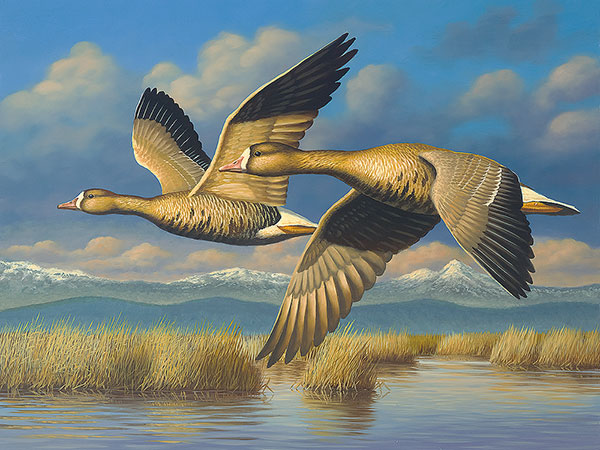This year, artists were asked to feature Ross’s goose, hooded merganser, blue-winged teal, or redhead in their natural habitat. Sales of this stamp fund waterfowl management projects such as population surveys, banding, and wetland management, enhancement, and acquisition. A wetland rejuvenation and enhancement project at Fern Ridge Wildlife Area was completed in 2018, and more than 200 acres of waterfowl habitat adjacent to Klamath Wildlife Area was purchased and added to the wildlife area in 2019. These projects were funded in part or solely by sales of the Waterfowl Stamp. Purchase a Waterfowl Collector’s Stamp or art print.