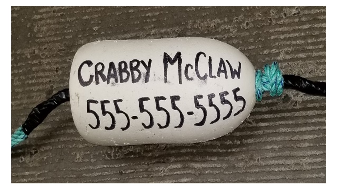 Recreational crab pots or rings used in the open ocean water and bays must have surface buoys for buoyancy so the gear can be retrieved. By regulation, the buoys must be marked with the owners first and last name or business name and at least one of the following: permanent address, phone number, ODFW ID number or vessel identification number. The information must be visible, legible, and permanent. This regulation does not apply to recreational crabbing from piers, jetties, or the beach where the pot is attached to shore while it is fishing.