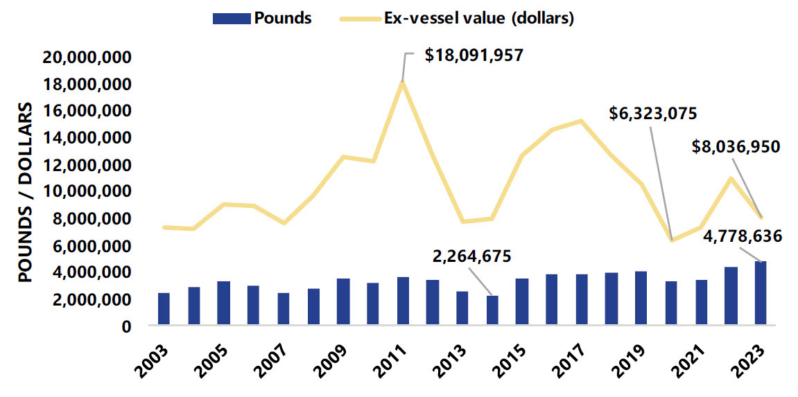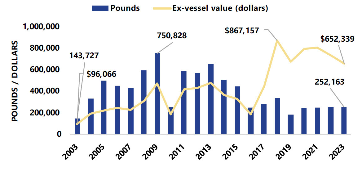 | Hagfish landings and ex-vessel values (adjusted for inflation, 2023), from 2003-2023. |