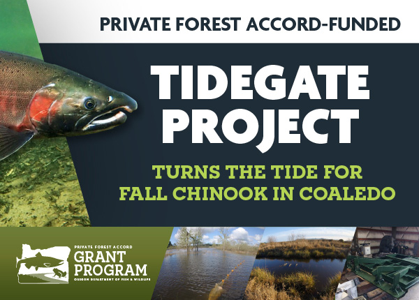 Thanks to the many partners on the project including the Coquille Indian Tribe, Coaledo Drainage District, The Bridges Foundation, the Coos Soil and Water Conservation District and private landowners in the area. Engineering assistance was provided by River Design Group (RDG) and tide gate fabrication/technology by Nehalem Marine.