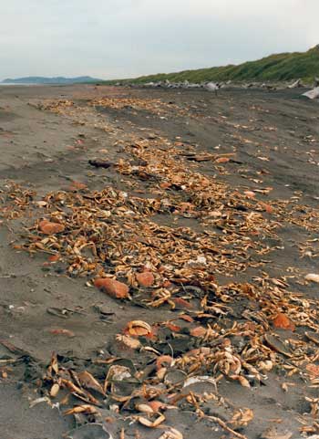 Observant beachgoers are familiar with crab exuvia, known more commonly as "crab molts". Determination on whether beached crabs are dead or simply the shell left behind from this process can be made with a quick check at the molt line. Since, the exuvia is very whole, as the crab leaves even its old gills, antennae, and mouthparts behind, this determination usually requires a good look. In summer months, when Dungeness crab molting activity peaks, ODFW usually receives calls reporting "many dead crab on the beach" which are almost always these exuvia or "molts". |