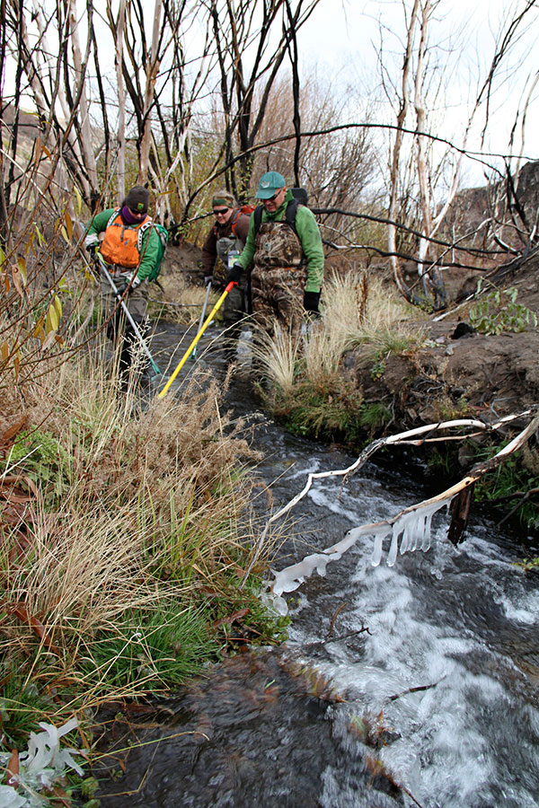 | From left to right: From left to right: Christine Clapp, ODFW Newport, Shannon Hurn, ODFW Hines, and Alan Mauer, USFWS Bend, use a backpack electrofisher to stun and capture trout on McDermitt Creek. - ODFW photo - |