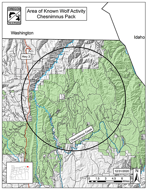April 18, 2023 – Four wolves were documented in the Chesnimnus Pack area at the end of 2022. The pack was not counted as a breeding pair.